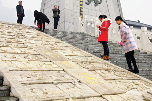 2月11日,原平市天牙山景區(qū)忠孝臺前,游人正在看忠孝雕刻,讀古典忠孝故事,接受忠孝文化再教育。天牙山以“忠孝”主題聞名,很多鮮活動人的忠孝故事都能從這里尋覓,成為公眾接受忠孝文化的旅游地。(吉建平 攝)