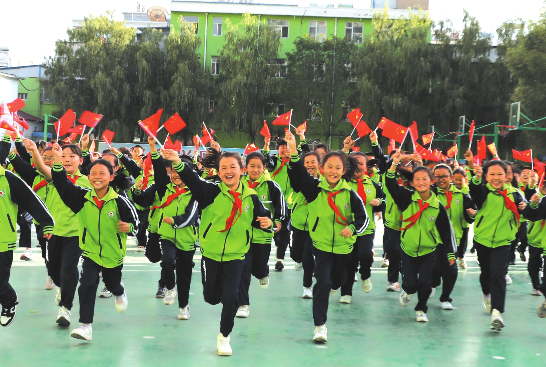 原平市第一小學(xué)的小學(xué)生揮舞著國旗,喜迎國慶。褚震攝