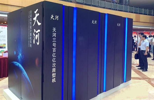 △2019年7月6日,“紀(jì)念中國超級(jí)計(jì)算事業(yè)發(fā)展四十年暨國家超級(jí)計(jì)算天津中心成立十周年”活動(dòng)在天津?yàn)I海新區(qū)舉行。這是活動(dòng)現(xiàn)場(chǎng)展示的“天河三號(hào)”百億億次原型機(jī)。