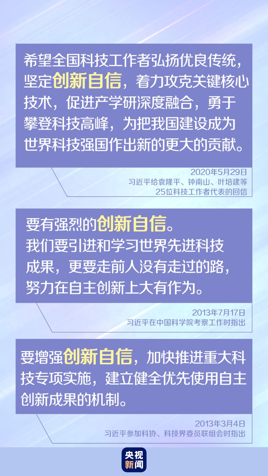今年“全國科技工作者日”到來之際,習(xí)近平給25位科技工作者代表回信,再次強(qiáng)調(diào)“堅(jiān)定創(chuàng)新自信”,勉勵(lì)廣大科技工作者為把我國建設(shè)成為世界科技強(qiáng)國作出新的更大的貢獻(xiàn)。