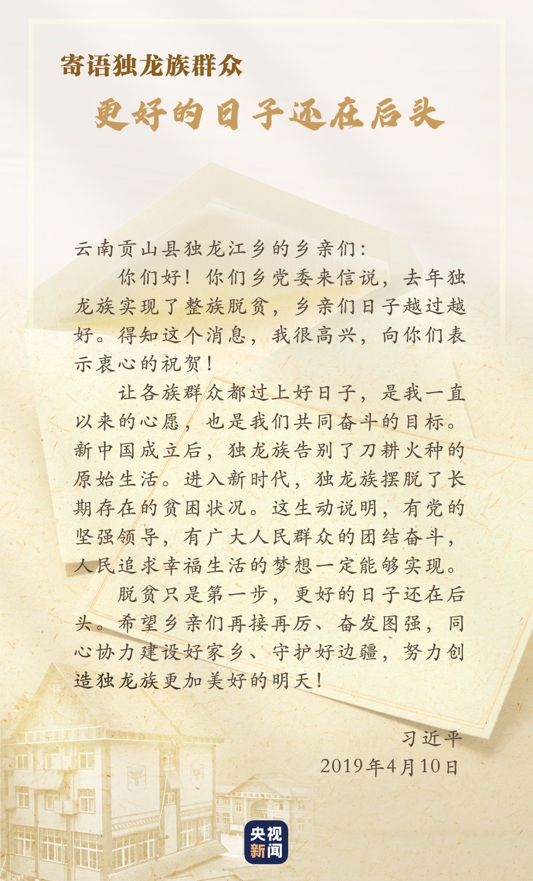 2018年,獨龍江鄉(xiāng)6個行政村整體脫貧,獨龍族實現(xiàn)整族脫貧,基礎(chǔ)設(shè)施、特色產(chǎn)業(yè)、社會事業(yè)等都發(fā)生了巨大變化。貢山縣干部群眾再次給習(xí)近平寫信匯報脫貧成績,習(xí)近平得知后非常高興,向他們表示“衷心的祝賀”,并勉勵鄉(xiāng)親們?yōu)檫^上更加幸福美好的生活繼續(xù)團結(jié)奮斗。