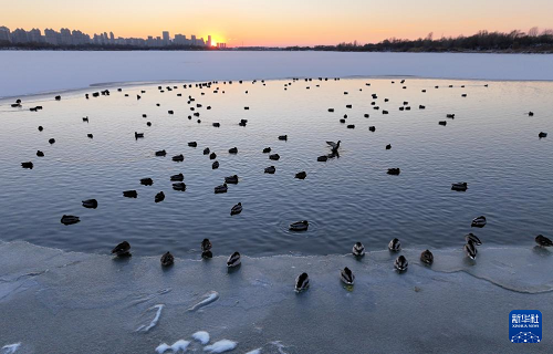 | 哈爾濱:綠頭鴨群戲“寒江雪” |