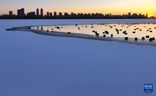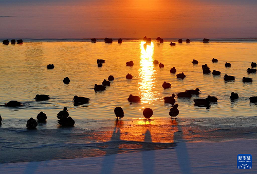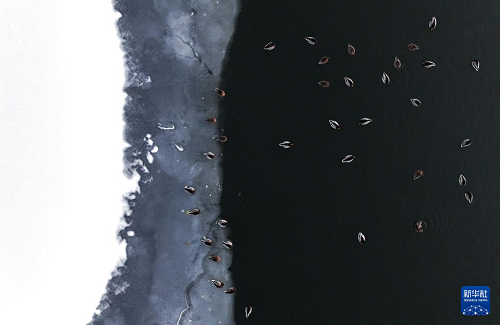 11月27日在松花江哈爾濱段拍攝的綠頭鴨寒江休憩、覓食場景(無人機(jī)照片)。(新華社發(fā) 張樹 攝) 11月27日,一群綠頭鴨聚集在降雪后的松花江哈爾濱段未結(jié)冰水域覓食、休憩。落日金暉映照下,白雪、寒江和綠頭鴨組成了一幅寒江“戲雪”畫卷。 (責(zé)任編輯:蔡文斌) |