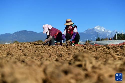 12月7日,農(nóng)民在云南省麗江市玉龍縣黃山街道的一處空地分揀、晾曬中藥材當(dāng)歸。(新華社發(fā) 趙慶祖 攝)