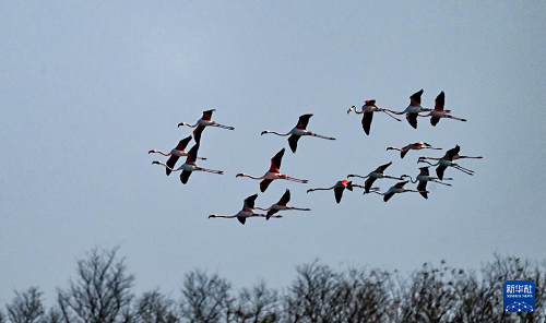 12月8日,火烈鳥(niǎo)在江蘇東臺(tái)條子泥濕地飛翔。(新華社發(fā) 孫家錄 攝)