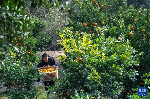 12月11日,在湖北省宜昌市長陽土家族自治縣漁峽口鎮(zhèn)巖松坪村,村民在搬運剛采摘的清江椪柑。(新華社記者 杜子璇 攝)