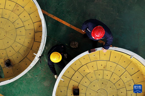 12月16日,在山東青島中青林集團(tuán)有限公司生產(chǎn)車間,工人在安裝攪拌機(jī)襯板(無(wú)人機(jī)照片)。(新華社發(fā) 王海濱 攝)