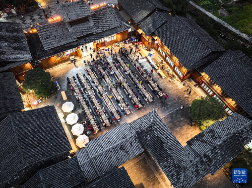 在貴州省黎平縣肇興侗寨,侗族同胞與來賓在侗年活動中共享長桌宴(12月20日攝,無人機照片)。(新華社記者 楊文斌 攝)