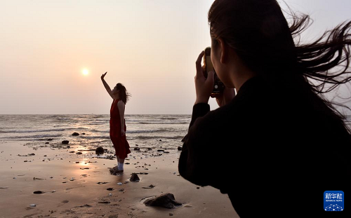 1月2日,游客在廣東湛江市徐聞縣角尾鄉(xiāng)燈樓角觀看日出并留影。(新華社發(fā) 訚洪 攝)