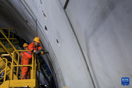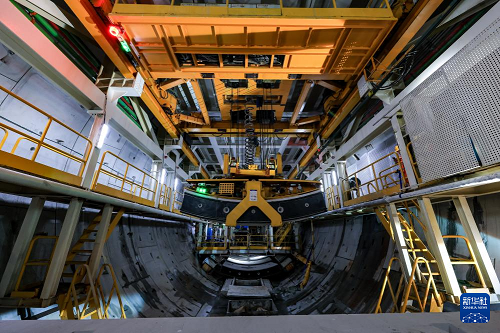 1月6日,中鐵十四局施工人員在“深江1號”盾構(gòu)機上進行管片螺栓緊固工作。(新華社記者 毛思倩 攝)