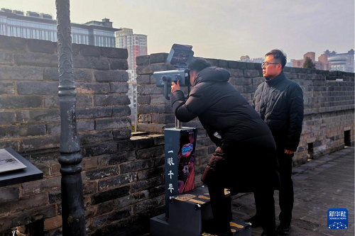 2026年1月5日,趙彬(右)在西安城墻上檢查城墻的“一眼千年”AR望遠鏡設(shè)備。新華社發(fā)