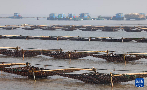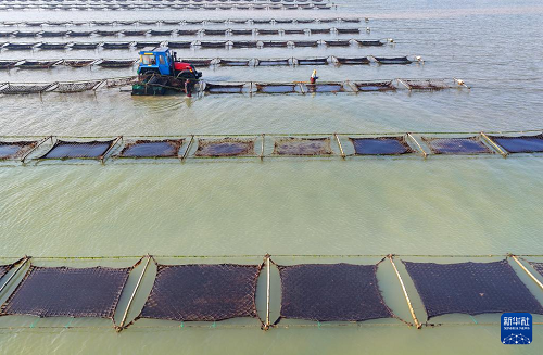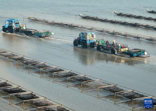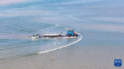 1月15日,養(yǎng)殖戶駕駛拖拉機趁著退潮出海采收紫菜(無人機照片)。(新華社發(fā) 徐書影 攝)