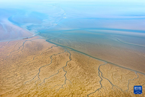 1月15日,養(yǎng)殖戶駕駛拖拉機趁著退潮出海采收紫菜(無人機照片)。(新華社發(fā) 許叢軍 攝)