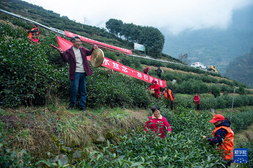 1月29日,湖北省秭歸縣郭家壩鎮(zhèn)王家?guī)X村茶農(nóng)在“絲綿茶1號(hào)”茶園采摘茶葉嫩芽。(新華社發(fā) 雷勇 攝)