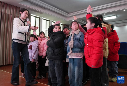 2月8日,在河南省沁陽市朱載堉音樂廳,小朋友們?cè)凇吧賰捍和怼鄙媳硌菁w詩朗誦《非遺里的中國》。(新華社發(fā) 楊帆 攝)