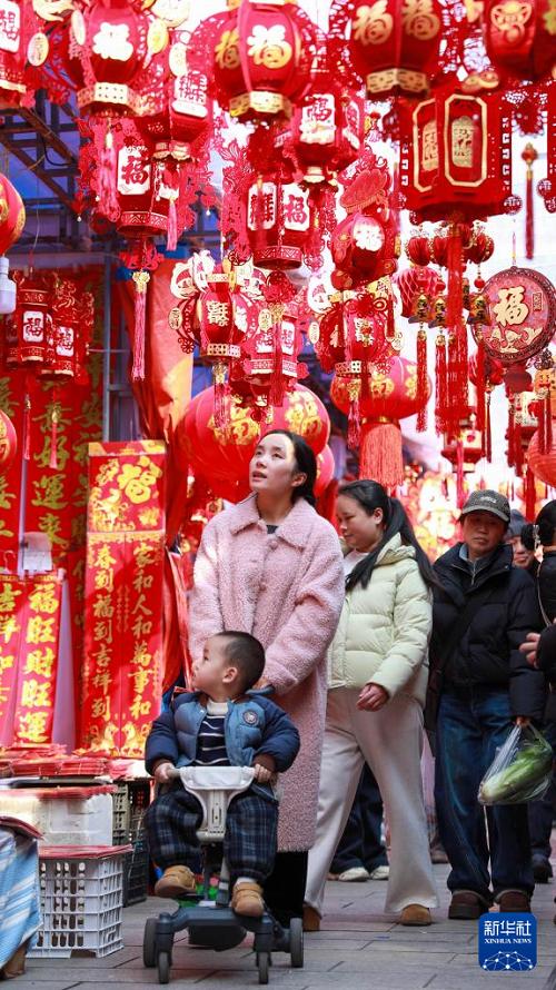 2月11日,家長(zhǎng)帶著孩子在貴州省都勻市年畫市場(chǎng)選購(gòu)春節(jié)飾品。(新華社發(fā) 肖偉 攝)