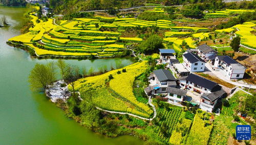 重慶市黔江區(qū)阿蓬江鎮(zhèn)大坪村油菜花開放(3月4日攝,無人機照片)。(新華社發(fā) 楊敏 攝)