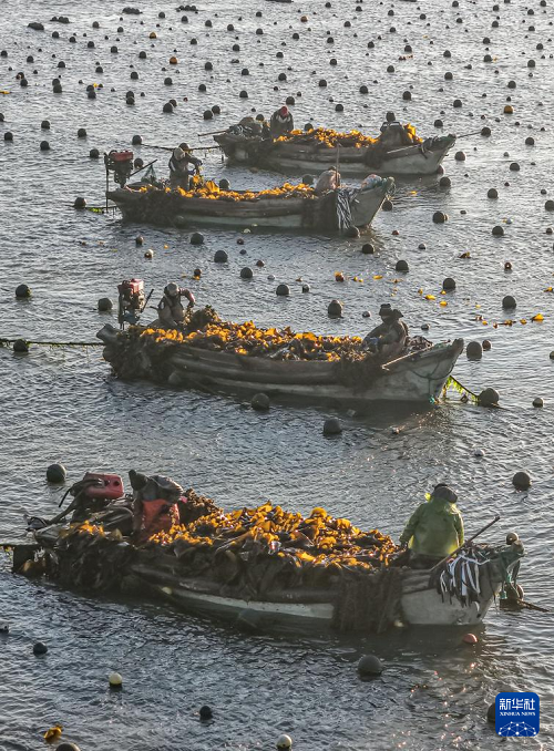 眼下,在我國海帶主產(chǎn)區(qū)山東省榮成市,海洋牧場海帶養(yǎng)殖區(qū)一派繁忙景象。養(yǎng)殖戶對近岸養(yǎng)殖區(qū)達(dá)到成熟標(biāo)準(zhǔn)的海帶分批收割,為后期收割的海帶留出生長空間,以便提高海帶產(chǎn)量和質(zhì)量。