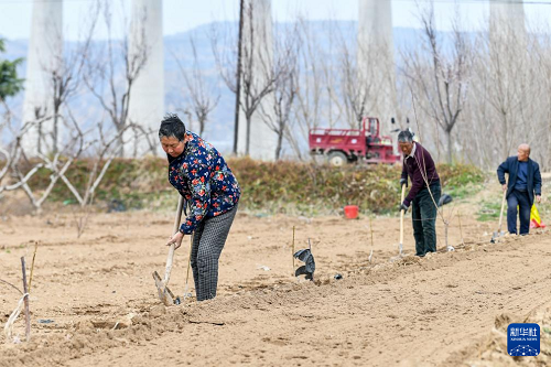 3月19日,山西省運城市平陸縣張村鎮(zhèn)的農(nóng)民在種植樹苗。(新華社記者 曹陽 攝)