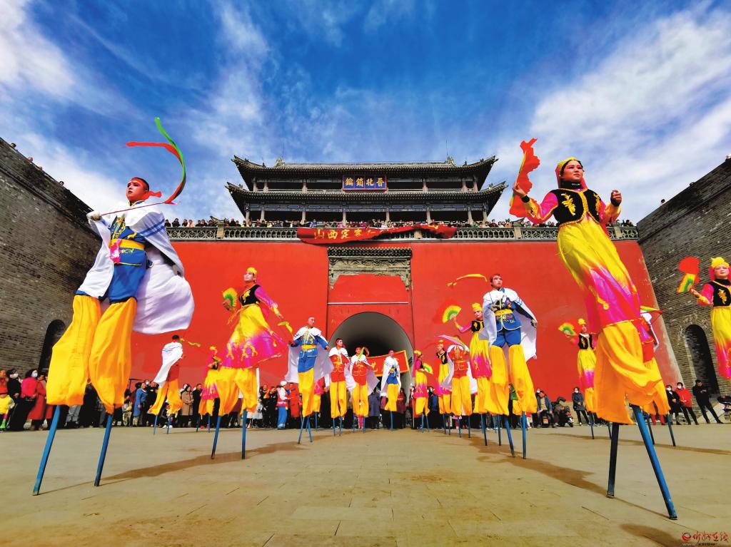 定襄社火和各類傳統(tǒng)民俗活動歷史悠久,各類極具地方特色的民俗文化活動觀賞性很強,二兔藝術(shù)團盡情舞動,表情歡悅;老干部藝術(shù)團鶴發(fā)童顏,精神抖擻;夢之藍旗袍隊舉止高雅,體態(tài)大方;紅燈籠高蹺隊腳踏雙木,輕松自如……有趣的互動,讓大家樂在其中。喜慶的樂曲,歡快的表演,充分展現(xiàn)了人民群眾的新生活、新風(fēng)尚、新面貌,迎來觀眾一片喝彩聲,讓游客感受到了定襄的民俗文化魅力。(張存良 攝)