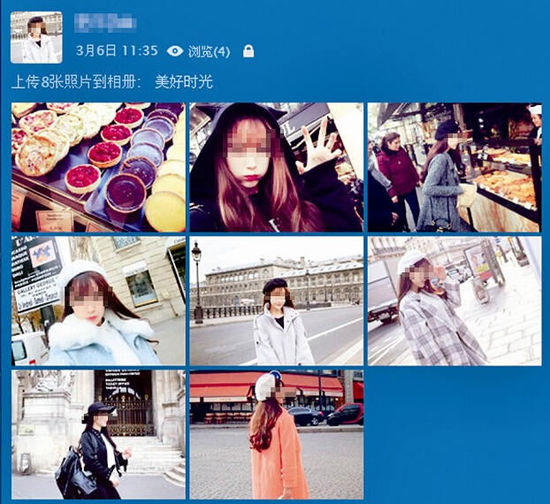 “最好找粉絲在10萬以下的網(wǎng)紅?!痹谖⒉┥?,魏強(qiáng)嫻熟地搜到一個(gè)名為“Panny”的模特,點(diǎn)擊其關(guān)注的好友,找到類似幾名網(wǎng)紅,讓記者下載她們的照片,用修圖軟件清除圖片上的水印,再上傳到QQ空間。魏強(qiáng)在QQ上假扮的“白富美”網(wǎng)名叫“Eiffel”,他還煞費(fèi)苦心地更新“Eiffel”的QQ空間。