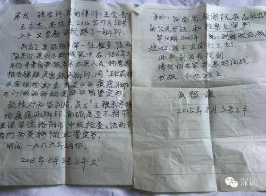 2015年5月6日,吳留成和律師王永杰、王常清把吳留鎖在獄中寫的申訴書遞交到洛陽市檢察院控申部門。