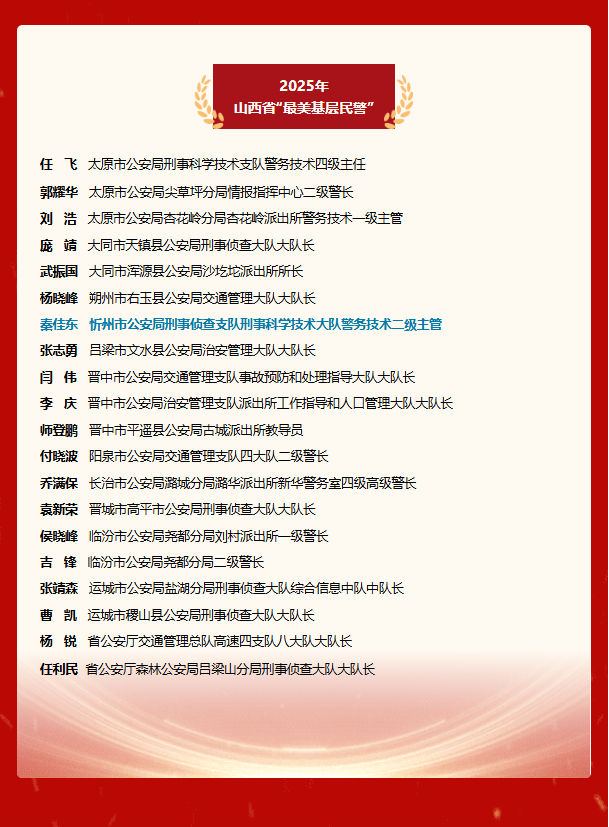 任飛、郭耀華、劉浩、龐靖、武振國(guó)、楊曉峰、秦佳東、張志勇、閆偉、李慶、師登鵬、付曉波、喬滿保、袁新榮、侯曉峰、吉鋒、張靖森、曹凱、楊銳、任利民20名同志光榮入選,其中,太原市公安局刑事科學(xué)技術(shù)支隊(duì)民警任飛還入選2025全國(guó)“最美基層民警”。