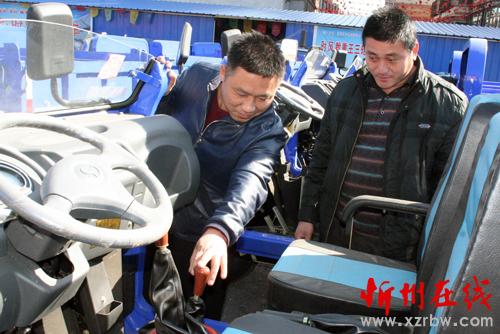 2月20日,原平市子干村的農(nóng)民正在農(nóng)機銷售處挑選時風農(nóng)用車,春節(jié)過后,該市農(nóng)機市場紅紅火火,農(nóng)民們早備耕,為今年的春耕生產(chǎn)打下良好基礎。(趙春曉 攝)