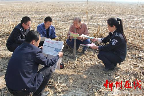 怎樣把《中華人民共和國(guó)大氣污染防治法》和《五臺(tái)縣人民政府嚴(yán)防森林火災(zāi)的通告》宣傳到人?五臺(tái)縣環(huán)境保護(hù)局、環(huán)境監(jiān)察大隊(duì)分組劃片,組織環(huán)保人員深入到田間地頭,面對(duì)面讀報(bào)給農(nóng)民聽(tīng),手遞手散傳單讓農(nóng)民看,為農(nóng)民解釋燒秸稈、燒地堰、燒荒等野外違規(guī)用火行為的危害。臺(tái)城鎮(zhèn)西關(guān)村66歲的農(nóng)民張存在就高興地對(duì)縣環(huán)境監(jiān)察人員說(shuō):“你們這樣解釋,咱懂,“地頭環(huán)保”咱農(nóng)民也記得牢,我家4畝地的秸稈保證不燒一根,咱漚糞去,多打糧,又不污染?!眻D為地頭宣傳環(huán)境保護(hù),增強(qiáng)農(nóng)民環(huán)保意識(shí)。(金俊賢 攝)
