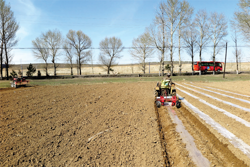時下正值春耕春播時節(jié),我市各地的農(nóng)民忙著翻地、撒肥、鋪膜、犁土、播種,田野上拖拉機(jī)、播種機(jī)等農(nóng)機(jī)來回穿梭,一片繁忙景象。圖為4月21日五寨縣小河頭村村民正在鋪膜。(張志遠(yuǎn) 攝)