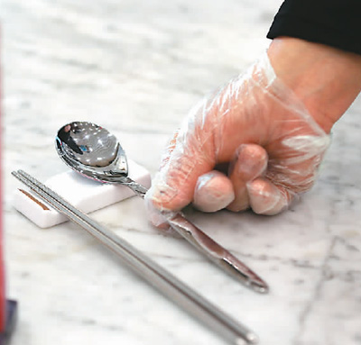 在北京市朝陽(yáng)大悅城一家餐飲店內(nèi),食客隔位而坐,餐具“公私”分明。“開始使用公筷、公勺時(shí),有點(diǎn)不習(xí)慣,不過現(xiàn)在已經(jīng)適應(yīng)了,分著吃更安全?!痹诘陜?nèi)用餐的黃先生說。