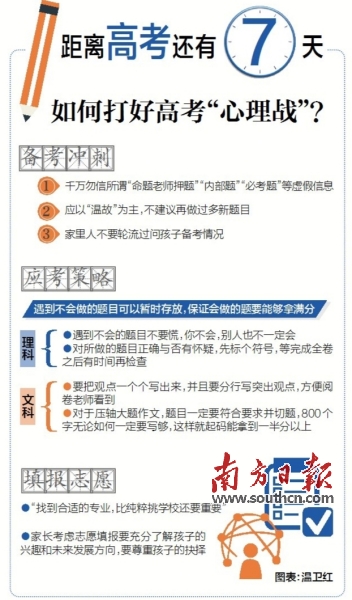 張敏強(qiáng)提醒,沖刺階段切勿盲目相信網(wǎng)上所謂的“內(nèi)部題”“必考題”,應(yīng)以“溫故”為主,不建議再做過多新題目。他提醒家長,考慮志愿填報要充分了解孩子的興趣和未來發(fā)展方向,要尊重孩子的抉擇,“找到合適的專業(yè),比純粹挑學(xué)校還要重要。”