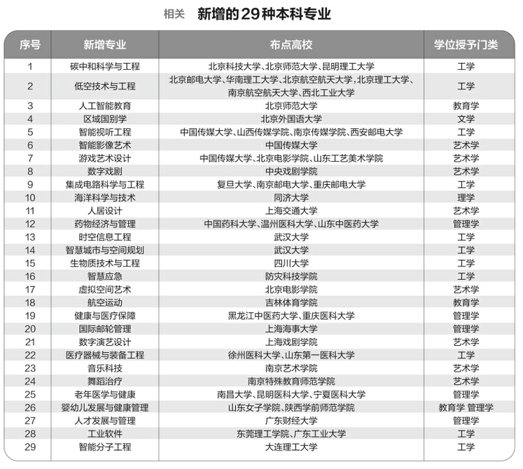 據(jù)悉,此次增設(shè)的29種新專業(yè),充分體現(xiàn)國家戰(zhàn)略、市場(chǎng)需求和科技發(fā)展?fàn)恳诜?wù)國家戰(zhàn)略方面,增設(shè)了區(qū)域國別學(xué)、碳中和科學(xué)與工程、海洋科學(xué)與技術(shù)、健康與醫(yī)療保障等專業(yè);面向科技發(fā)展前沿,增設(shè)了智能分子工程、醫(yī)療器械與裝備工程、時(shí)空信息工程等專業(yè);主動(dòng)適應(yīng)市場(chǎng)需求,增設(shè)了國際郵輪管理、航空運(yùn)動(dòng)等專業(yè)。同時(shí),聚焦人工智能賦能經(jīng)濟(jì)社會(huì)發(fā)展,增設(shè)人工智能教育、智能視聽工程、數(shù)字戲劇等專業(yè)。