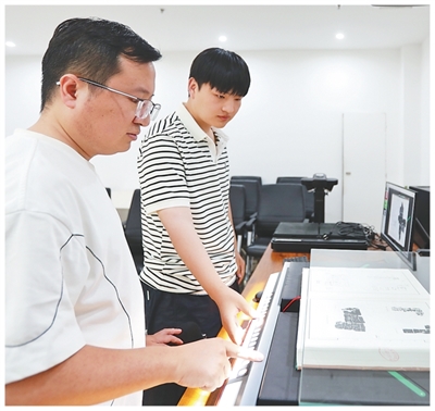 實驗室內,張展(左)正在和學生掃描錄入甲骨文拓本?;魜喥綌z