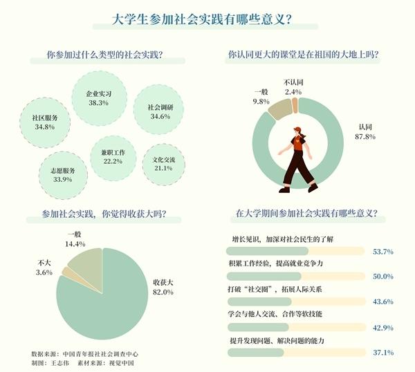 參與實(shí)地調(diào)研,開(kāi)展支教服務(wù),進(jìn)入企業(yè)實(shí)習(xí)……這個(gè)夏天,不少大學(xué)生選擇用社會(huì)實(shí)踐作為暑假的打開(kāi)方式。日前,中國(guó)青年報(bào)社社會(huì)調(diào)查中心聯(lián)合問(wèn)卷網(wǎng)(wenjuan.com)發(fā)布的一項(xiàng)有1000名大學(xué)生參與的調(diào)查顯示,82.0%的受訪大學(xué)生認(rèn)為參加暑期社會(huì)實(shí)踐收獲大。對(duì)于參加社會(huì)實(shí)踐的意義,53.7%的受訪大學(xué)生認(rèn)為能增長(zhǎng)見(jiàn)識(shí),加深對(duì)社會(huì)民生的了解,50.0%的受訪大學(xué)生認(rèn)為能積累工作經(jīng)驗(yàn),提高就業(yè)競(jìng)爭(zhēng)力。87.8%的受訪大學(xué)生認(rèn)同,更大的課堂是在祖國(guó)的大地上。