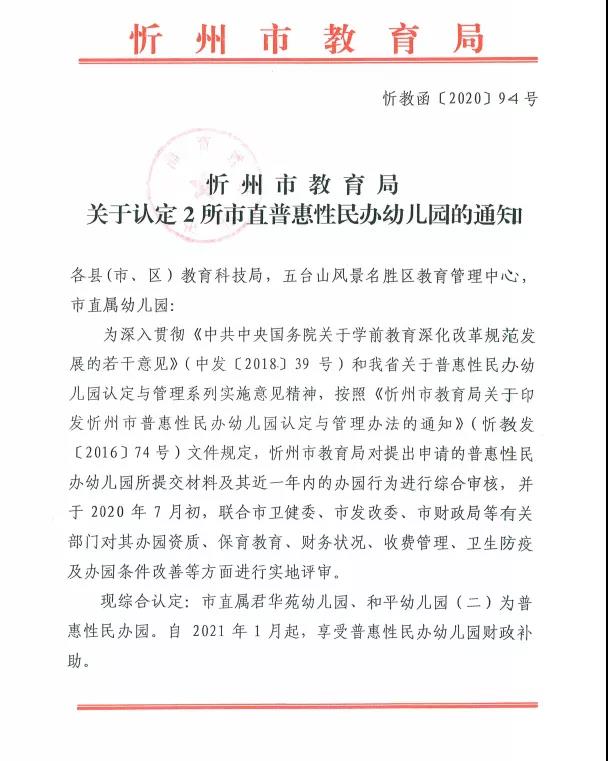 忻州市教育局關(guān)于認定2所市直普惠性民辦幼兒園的通知