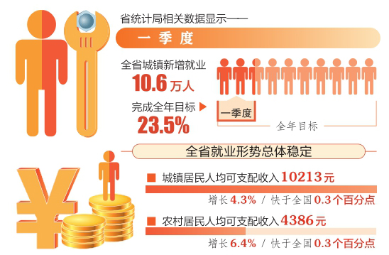經(jīng)濟(jì)穩(wěn),就業(yè)穩(wěn),收入增。省統(tǒng)計(jì)局相關(guān)數(shù)據(jù)顯示,一季度,全省城鎮(zhèn)居民人均可支配收入10213元,增長(zhǎng)4.3%,快于全國(guó)0.3個(gè)百分點(diǎn)。農(nóng)村居民人均可支配收入4386元,增長(zhǎng)6.4%,快于全國(guó)0.3個(gè)百分點(diǎn)。
