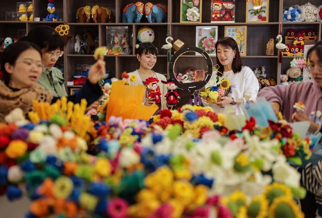 2023年11月9日,山東省榮成市巾幗創(chuàng)業(yè)孵化基地,婦女創(chuàng)客在包裝毛線編織手辦、花束訂單,迎接“雙十一”購物高峰。新華社發(fā)(李信君 攝)