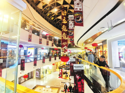 晚上6時30分,走進(jìn)省城龍湖萬達(dá)廣場,遠(yuǎn)遠(yuǎn)的,霓虹燈閃爍,商場內(nèi)的喜慶裝飾讓人眼花繚亂,“龍運(yùn)當(dāng)頭”“龍年大吉”“金龍賀歲”等祝福語隨處可見,各個商家門頭上設(shè)置的龍年掛飾為節(jié)日氛圍增色添彩,很多商品無論外形還是包裝,都巧妙地融入了龍年的獨(dú)特元素,市民們踏著歡快的新春背景音樂,挑選著年貨賀禮。