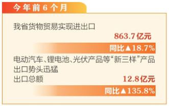 本報(bào)訊(記者孟婷)7月31日,記者從太原海關(guān)獲悉,據(jù)統(tǒng)計(jì),今年前6個(gè)月,我省貨物貿(mào)易實(shí)現(xiàn)進(jìn)出口863.7億元,同比增長18.7%,與此同時(shí),電動(dòng)汽車、鋰電池、光伏產(chǎn)品等“新三樣”產(chǎn)品出口勢頭迅猛,出口總額12.8億元,同比增長135.8%,遠(yuǎn)超傳統(tǒng)出口商品。這些高科技產(chǎn)品不僅代表山西制造業(yè)轉(zhuǎn)型升級(jí)的最新成果,也為山西在國際市場競爭中贏得了新優(yōu)勢。