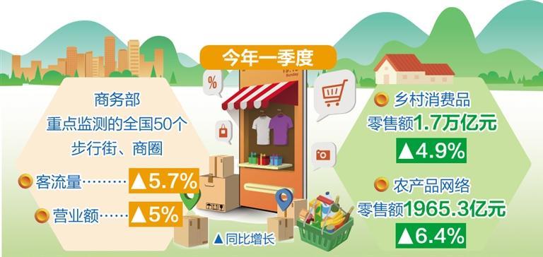 城市商業(yè)增速穩(wěn)定,一季度商務(wù)部重點監(jiān)測的全國50個步行街、商圈客流量、營業(yè)額同比分別增長5.7%、5%??h域消費市場持續(xù)升溫,鄉(xiāng)村消費品零售額1.7萬億元,同比增長4.9%,增速高于城鎮(zhèn)0.4個百分點。農(nóng)村電商蓬勃發(fā)展,全國農(nóng)村網(wǎng)絡(luò)零售額6697.5億元,同比增長5.1%;農(nóng)產(chǎn)品網(wǎng)絡(luò)零售額1965.3億元,同比增長6.4%。
