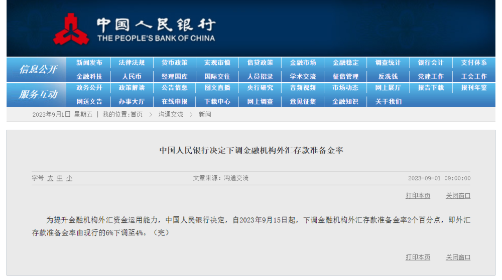 為提升金融機(jī)構(gòu)外匯資金運(yùn)用能力,中國人民銀行決定,自2023年9月15日起,下調(diào)金融機(jī)構(gòu)外匯存款準(zhǔn)備金率2個(gè)百分點(diǎn),即外匯存款準(zhǔn)備金率由現(xiàn)行的6%下調(diào)至4%。
