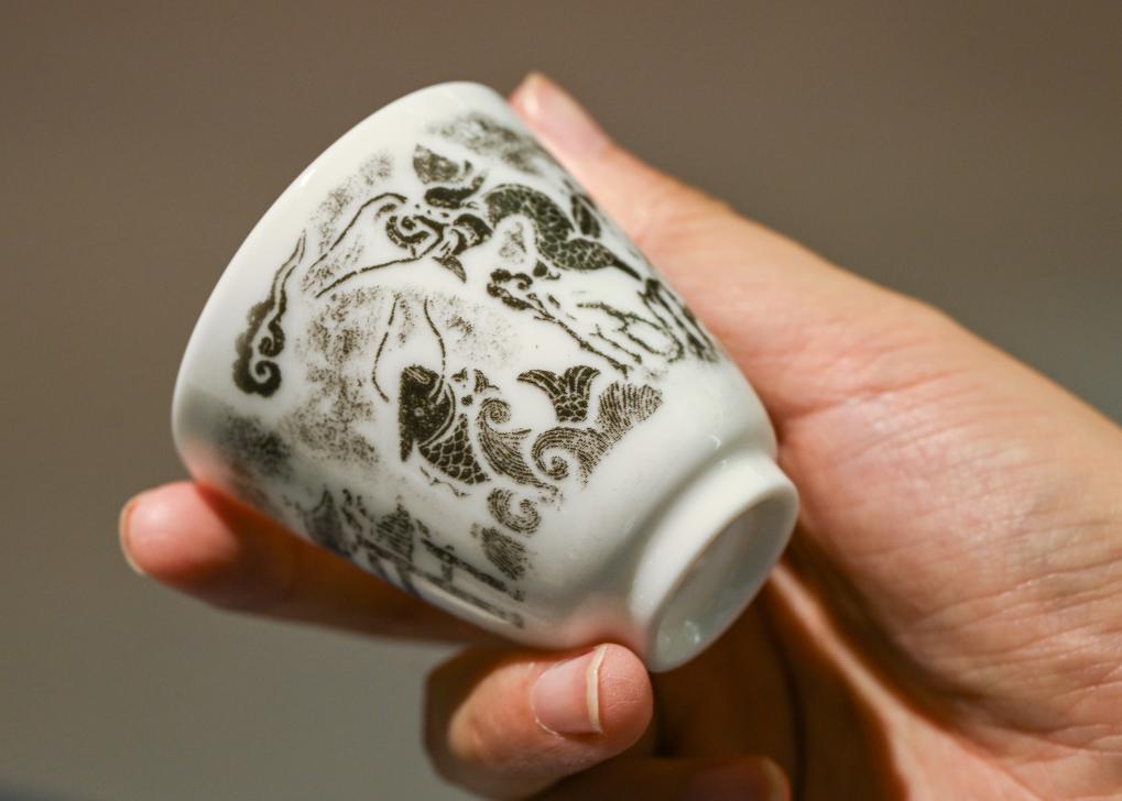 在浙江臺州仙居縣白塔鎮(zhèn)上葉村仙居巖畫藝術(shù)中心內(nèi),工作人員展示根據(jù)當(dāng)?shù)貛r畫開發(fā)的文創(chuàng)禮品(7月28日攝)。新華社記者 李賀 攝