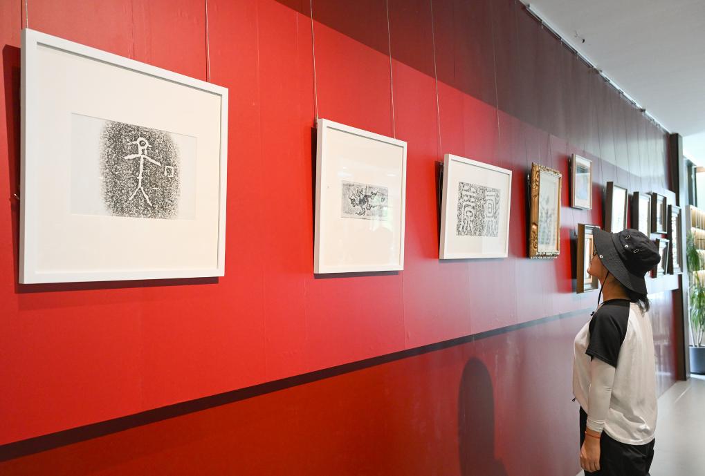 這是在浙江臺州仙居縣白塔鎮(zhèn)上葉村仙居巖畫藝術(shù)中心內(nèi)展出當(dāng)?shù)貛r畫拓片(7月28日攝)。新華社記者 李賀 攝
