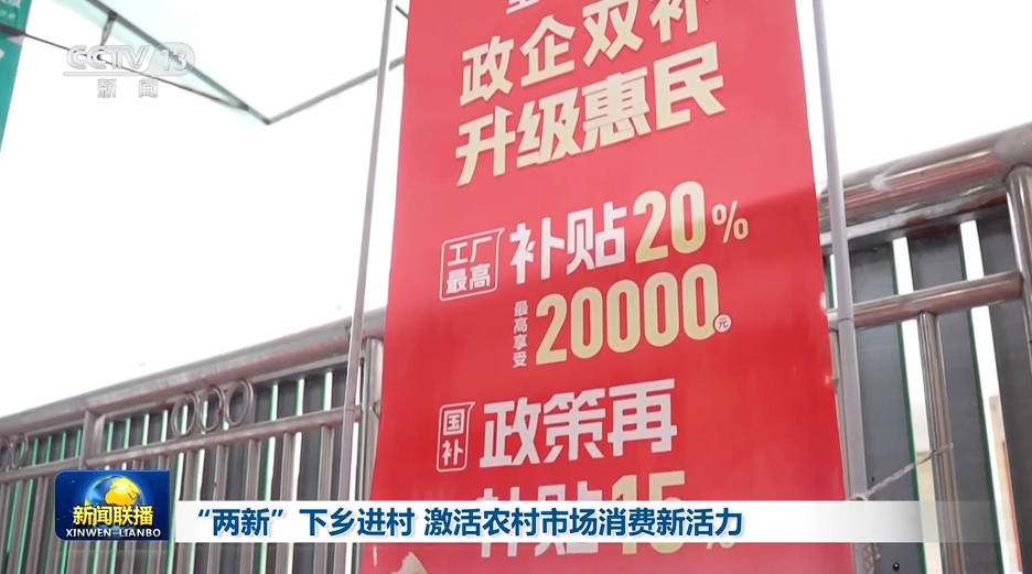 央視網消息(新聞聯(lián)播):“兩新”政策實施以來,各地通過擴大補貼范圍、優(yōu)化服務等措施,將實惠和便利送到鄉(xiāng)村,激發(fā)農村市場消費活力。