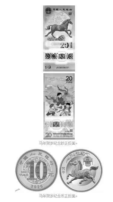 本次發(fā)行的2026年賀歲紀念幣面額10元,直徑27毫米,材質(zhì)為雙色銅合金材質(zhì),發(fā)行數(shù)量1億枚,正面為面額和年份,背面以剪紙風(fēng)格馬形象為主,輔以花燈和萱草圖案,壁面左側(cè)刊“丙午”字樣。紀念鈔面額20元,票面長145毫米,寬70毫米,采用塑料材質(zhì),發(fā)行量1億張,正面為馬造型主景,背面描繪兒童歡慶鑼鼓場景,同時融合傳統(tǒng)裝飾和多民族文字元素。二者均為我國法定貨幣,每人預(yù)約、兌換限額均為20張(枚)。