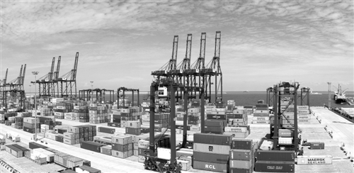 科倫坡南港集裝箱碼頭是中國和斯里蘭卡共建“21世紀(jì)海上絲綢之路”務(wù)實(shí)對接標(biāo)桿性項(xiàng)目,是南亞最深的集裝箱碼頭。據(jù)測算,南港碼頭項(xiàng)目在35年合同期直接稅賦將達(dá)18億美元。同時,在建設(shè)和經(jīng)營期間可分別為當(dāng)?shù)貏?chuàng)造3000個和7500個直接就業(yè)機(jī)會。圖為科倫坡南港集裝箱碼頭。 新華社發(fā)