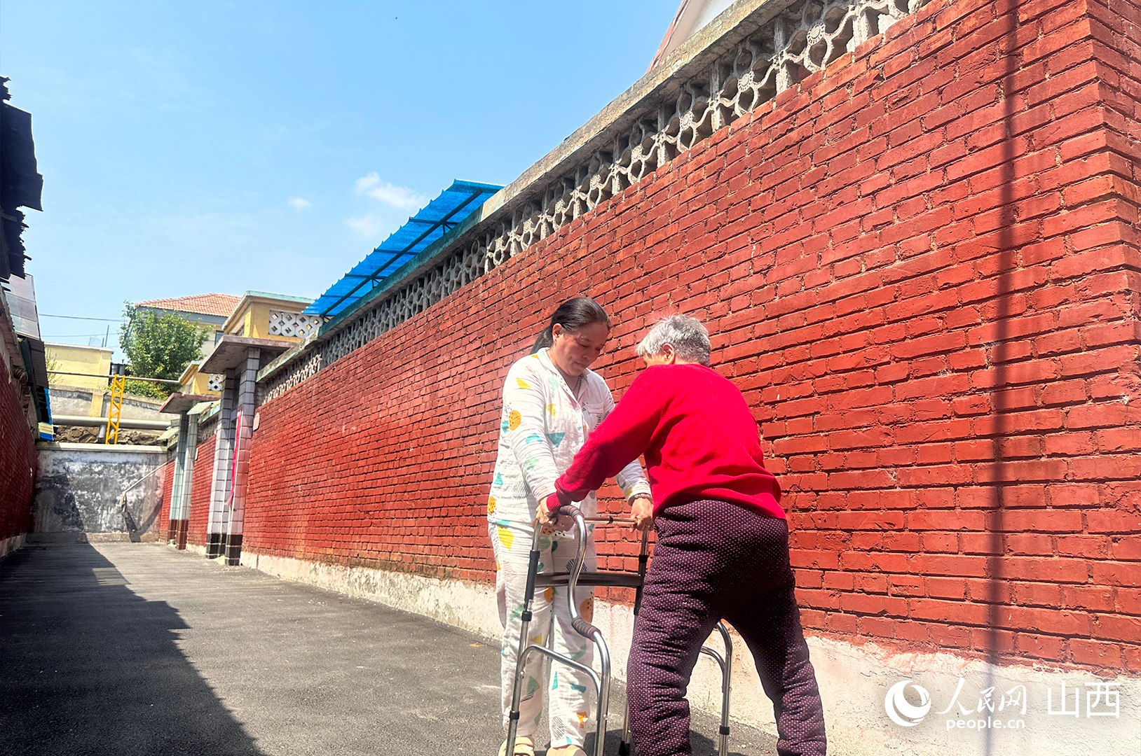 臨近中午,暖陽正好。村民李連香正扶著77歲的母親康復(fù)訓(xùn)練。李連香微微將助步器向前移動(dòng),母親跟著緩緩向前。跟母親聊聊小時(shí)候的故事,問問她想吃什么……一言一語間,母女二人面對(duì)面慢慢移動(dòng)著,走累了,就原地歇一會(huì)。