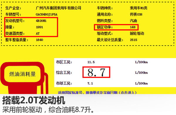 動力方面,從國家工信部公布的信息可知,廣汽傳祺GS8將搭載一臺型號為4B20M1的2.0升直列四缸渦輪增壓發(fā)動機,額定功率148千瓦,匹配6速自動變速箱。百公里綜合油耗分別為:兩驅車型8.7升,四驅車型9.3升。