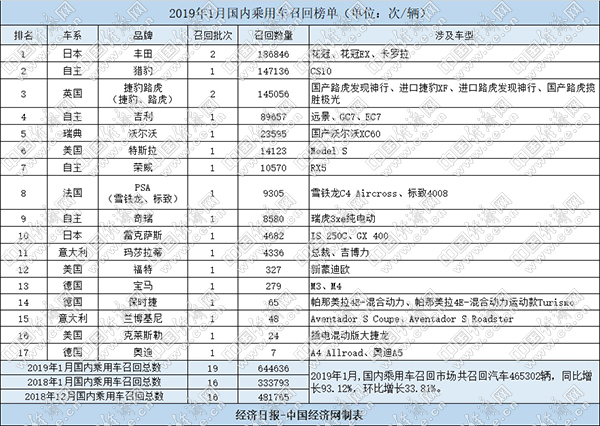 根據(jù)國家市場監(jiān)督管理總局缺陷產(chǎn)品管理中心1月份發(fā)布的召回公告,經(jīng)濟(jì)日報-中國經(jīng)濟(jì)網(wǎng)汽車頻道經(jīng)過匯總、統(tǒng)計(jì),整理出“2019年1月國內(nèi)乘用車召回榜單”。1月,國內(nèi)乘用車市場發(fā)布19起召回公告,共涉及19個品牌的644636輛汽車,同比增長93.12%,環(huán)比增長33.81%。
